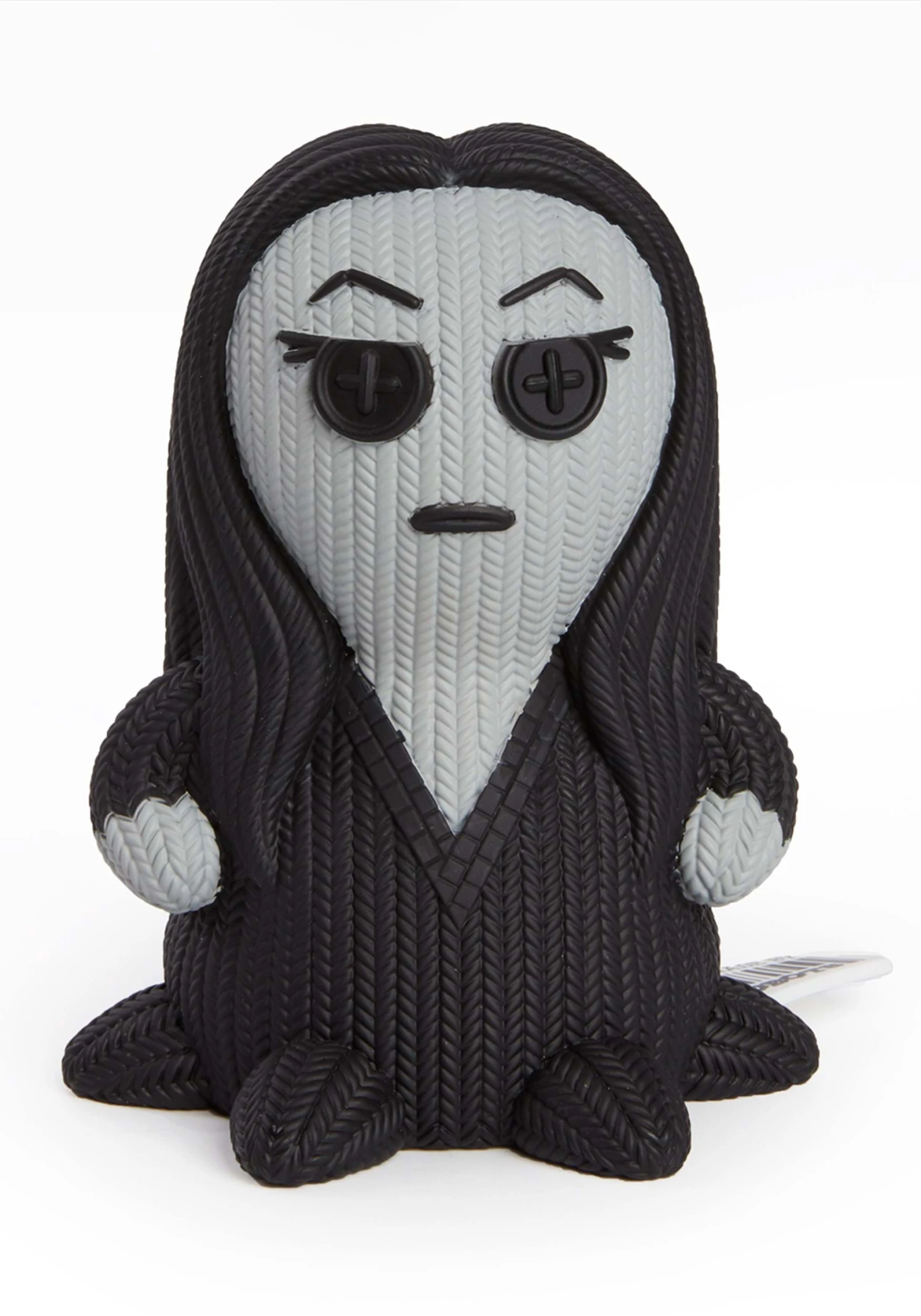 One-half of the most iconic goth couple on the silver screen, Morticia Addams is elegant and confident and puts on an air of dark beauty. This Morticia Handmade by Robots Vinyl Figure is sculpted to look like it’s made out of tightly-knit yarn–but it’s actually plastic! So even though it may look soft and plush, with no stitch dropped or missed, there are no moving parts and no stuffing to lose. Morticia measures 5 inches tall, and her dress hem doubles as sturdy base to keep her upright at all times. She’s mysterious, she’s spooky, and she’s the perfect addition to your Charles Addams collection.