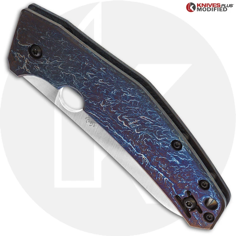 The MODIFIED illustrated Spyderco Knife is the Spyderco SpydieChef Knife, designed in collaboration with Marcin Slysz, that features a 3.32″ blade made of ultra corrosion resistant LC200N ball bearing steel, .118″ thick. The blade of this Spyderco knife has a flat grind and the Spyderco hole for ambidextrous one hand opening. The titanium handle WITH ADDED MAYHEM FINISH, 4.46″ closed, has open back constuction for easy cleaning, the sturdy R.I.L. (Reeve Integral Lock), and a lanyard hole. A side to side reversible wire clip is mounted at the butt end of this Spyderco Knife. The MODIFIED Spyderco SpydieChef Knife has an overall open length of 7.78″ and it weighs 3.8 ounces. Made in Taiwan.